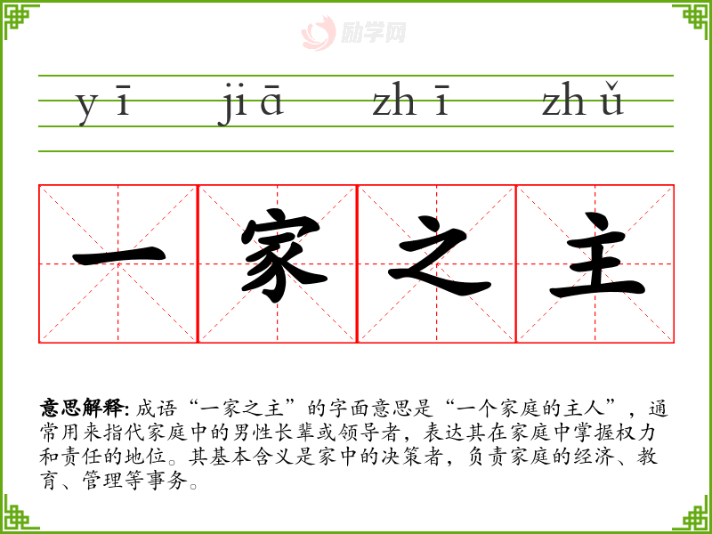 成语“一家之主”的字面意思是“一个家庭的主人”,通常用来指代家庭中的男性长辈或领导者,表达其在家庭中掌握权力和责任的地位。其基本含义是家中的决策者,负责家庭的经济、教育、管理等事务。