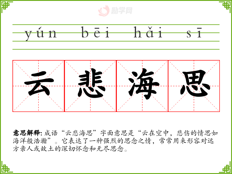 成语“云悲海思”字面意思是“云在空中,悲伤的情思如海洋般浩瀚”。它表达了一种强烈的思念之情,常常用来形容对远方亲人或故土的深切怀念和无尽思念。