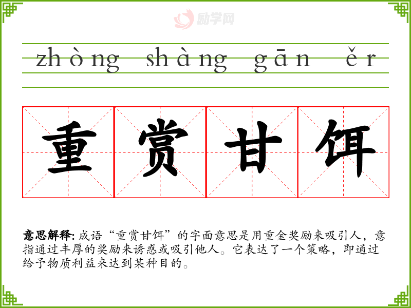 成语“重赏甘饵”的字面意思是用重金奖励来吸引人,意指通过丰厚的奖励来诱惑或吸引他人。它表达了一个策略,即通过给予物质利益来达到某种目的。