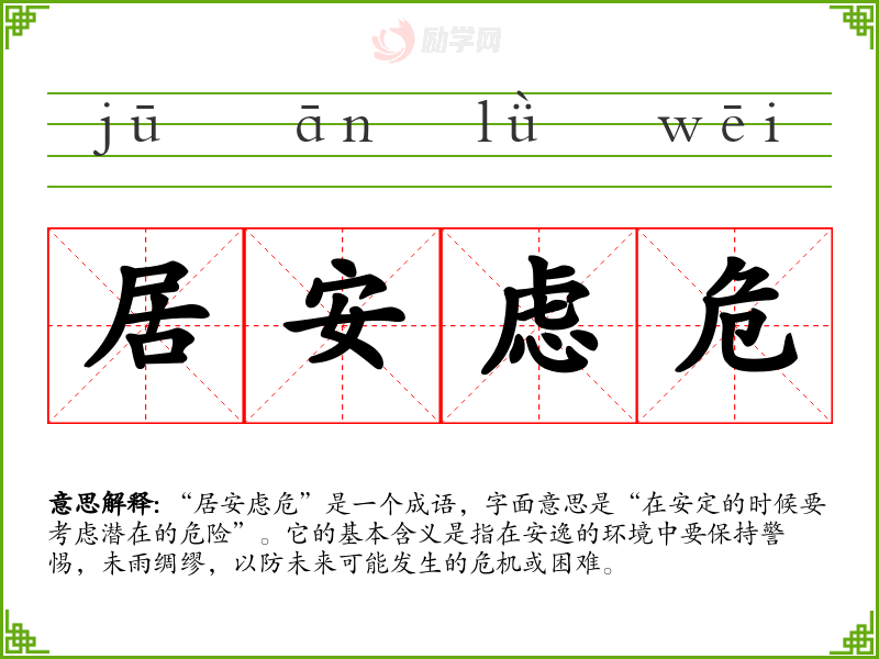 “居安虑危”是一个成语,字面意思是“在安定的时候要考虑潜在的危险”。它的基本含义是指在安逸的环境中要保持警惕,未雨绸缪,以防未来可能发生的危机或困难。