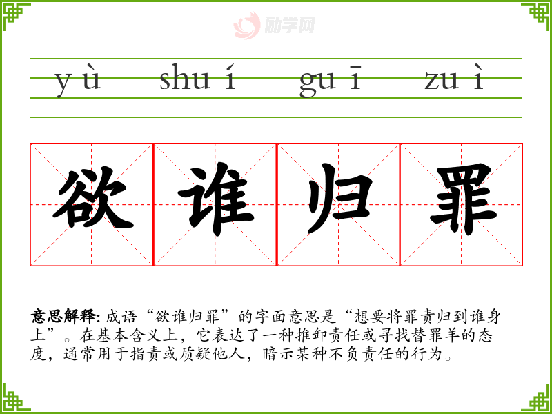成语“欲谁归罪”的字面意思是“想要将罪责归到谁身上”。在基本含义上,它表达了一种推卸责任或寻找替罪羊的态度,通常用于指责或质疑他人,暗示某种不负责任的行为。