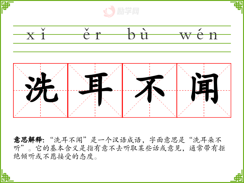 “洗耳不闻”是一个汉语成语,字面意思是“洗耳朵不听”。它的基本含义是指有意不去听取某些话或意见,通常带有拒绝倾听或不愿接受的态度。