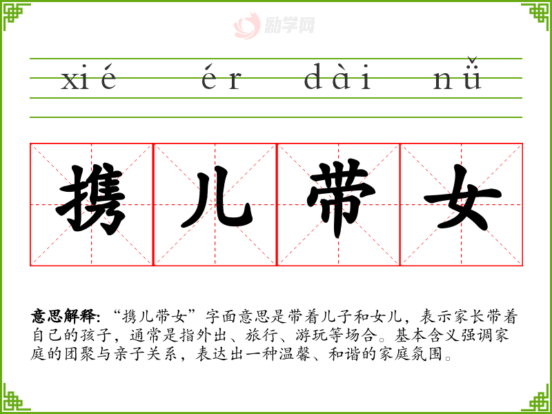 “携儿带女”字面意思是带着儿子和女儿,表示家长带着自己的孩子,通常是指外出、旅行、游玩等场合。基本含义强调家庭的团聚与亲子关系,表达出一种温馨、和谐的家庭氛围。