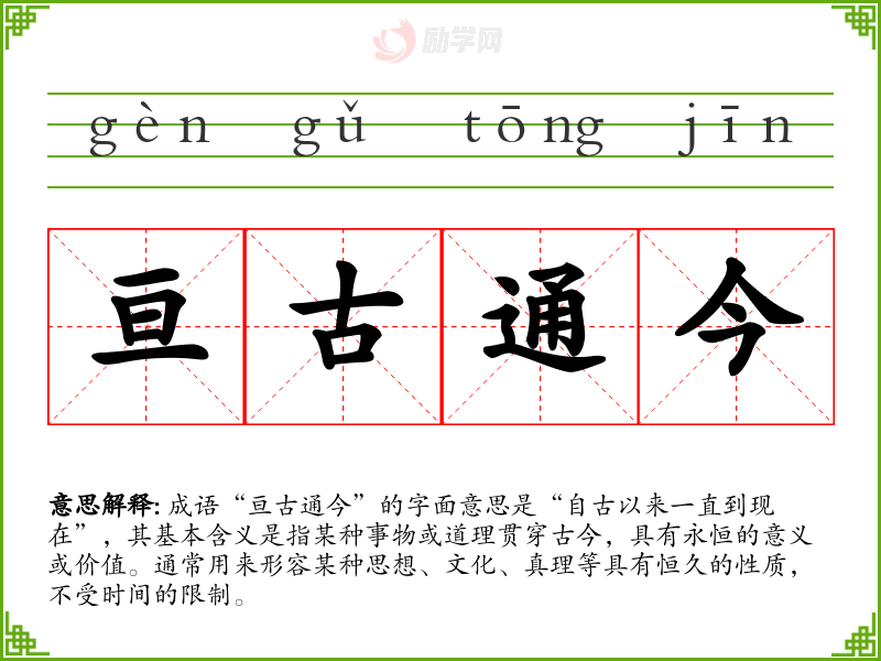成语“亘古通今”的字面意思是“自古以来一直到现在”,其基本含义是指某种事物或道理贯穿古今,具有永恒的意义或价值。通常用来形容某种思想、文化、真理等具有恒久的性质,不受时间的限制。