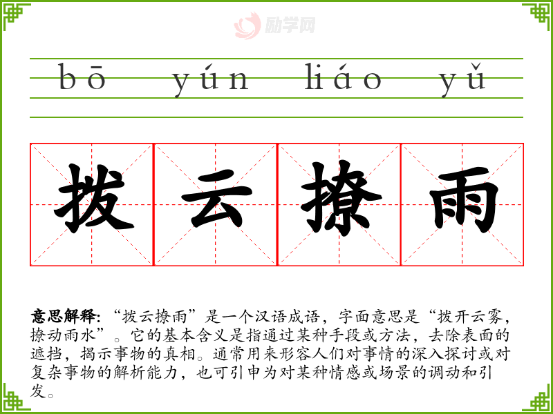 “拨云撩雨”给人一种清新、豁然开朗的感觉,像是经过一番努力后,终于看到了阳光。它让我联想到对生活的探索和对人际关系的理解,激励我在面对困难和复杂局面时,保持积极的态度。