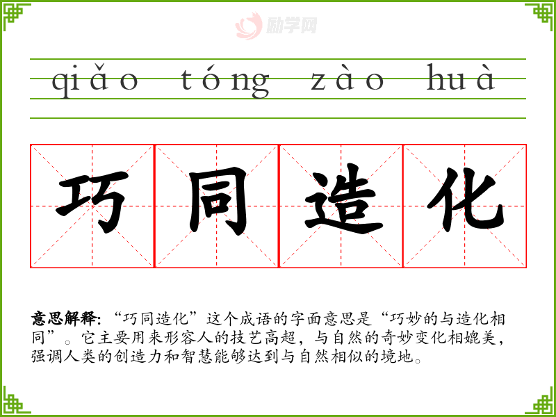 通过对“巧同造化”的学与分析,我认识到它不仅是一种对技艺的赞美,更是一种对人与自然和谐关系的深刻理解。这个成语提醒我在学和表达中,始终要尊重自然的法则,努力提升自己的创造力,追求更高的艺术境界。