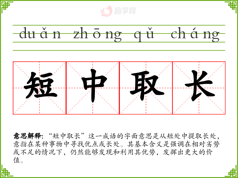 “短中取长”这一成语的字面意思是从短处中提取长处,意指在某种事物中寻找优点或长处。其基本含义是强调在相对劣势或不足的情况下,仍然能够发现和利用其优势,发挥出更大的价值。
