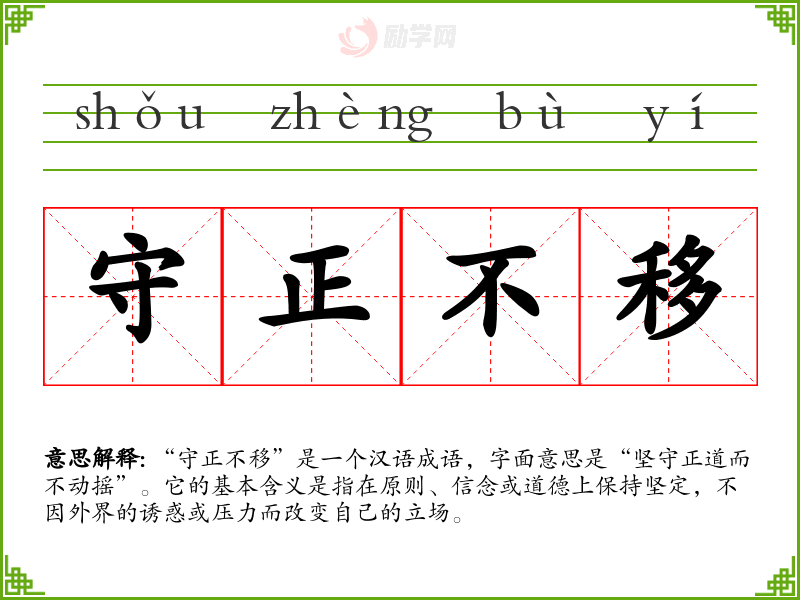 “守正不移”是一个汉语成语,字面意思是“坚守正道而不动摇”。它的基本含义是指在原则、信念或道德上保持坚定,不因外界的诱惑或压力而改变自己的立场。