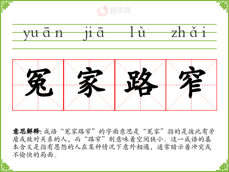 成语“冤家路窄”的字面意思是“冤家”指的是彼此有矛盾或敌对关系的人,而“路窄”则意味着空间狭小。这一成语的基本含义是指有恩怨的人在某种情况下意外相遇,通常暗示着冲突或不愉快的局面。