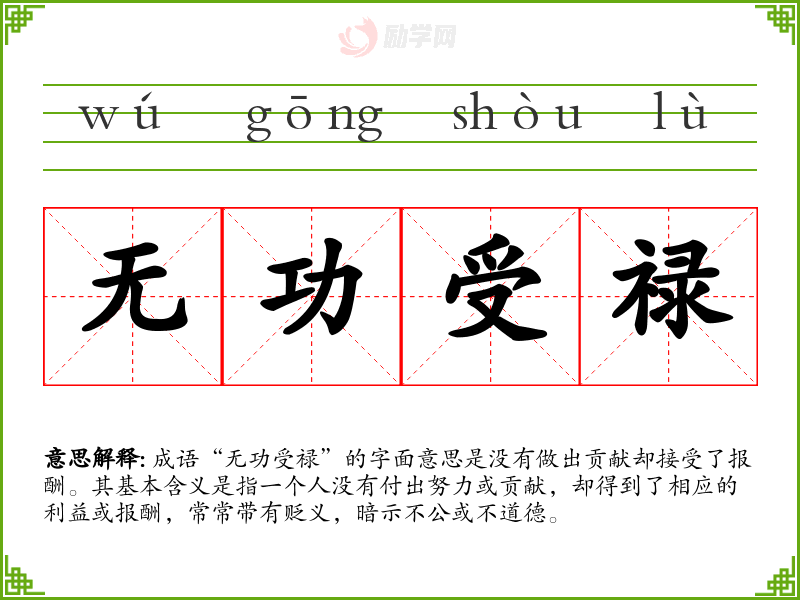 成语“无功受禄”的字面意思是没有做出贡献却接受了报酬。其基本含义是指一个人没有付出努力或贡献,却得到了相应的利益或报酬,常常带有贬义,暗示不公或不道德。