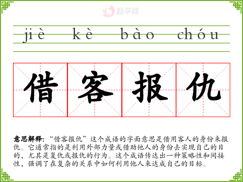 “借客报仇”这个成语的字面意思是借用客人的身份来报仇。它通常指的是利用外部力量或借助他人的身份去实现自己的目的,尤其是复仇或报仇的行为。这个成语传达出一种策略性和间接性,强调了在复杂的关系中如何利用他人来达成自己的目标。