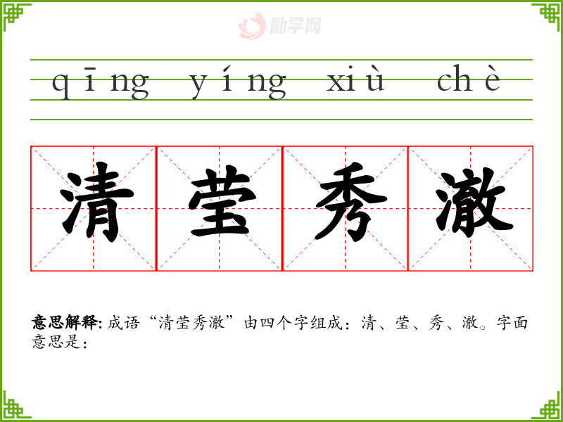 成语“清莹秀澈”由四个字组成:清、莹、秀、澈。字面意思是:
