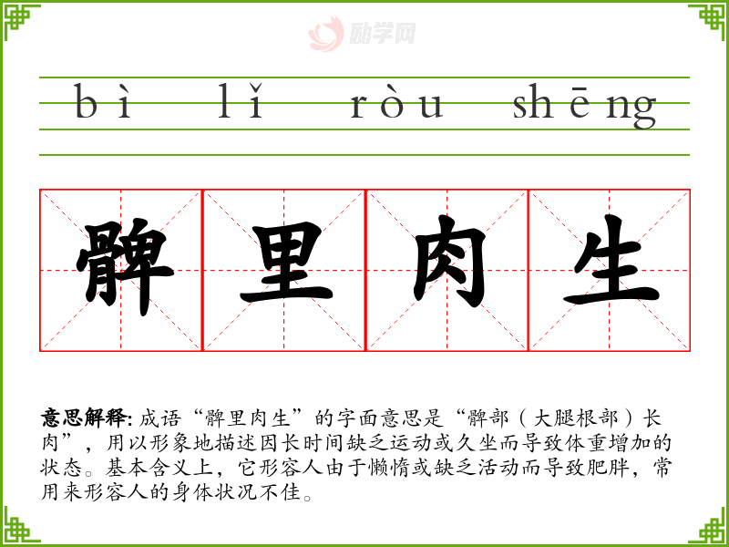 成语“髀里肉生”的字面意思是“髀部(大腿根部)长肉”,用以形象地描述因长时间缺乏**或久坐而导致体重增加的状态。基本含义上,它形容人由于懒惰或缺乏活动而导致肥胖,常用来形容人的身体状况不佳。