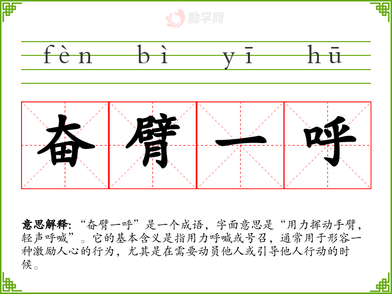 “奋臂一呼”是一个成语,字面意思是“用力挥动手臂,轻声呼喊”。它的基本含义是指用力呼喊或号召,通常用于形容一种激励人心的行为,尤其是在需要动员他人或引导他人行动的时候。