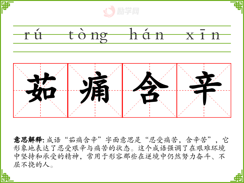 成语“茹痛含辛”字面意思是“忍受痛苦,含辛苦”,它形象地表达了忍受艰辛与痛苦的状态。这个成语强调了在艰难环境中坚持和承受的精神,常用于形容那些在逆境中仍然努力奋斗、不屈不挠的人。