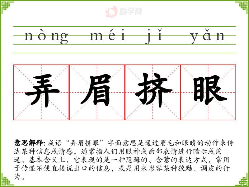 成语“弄眉挤眼”字面意思是通过眉毛和眼睛的动作来传达某种信息或情感,通常指人们用眼神或面部表情进行暗示或沟通。基本含义上,它表现的是一种隐晦的、含蓄的表达方式,常用于传递不便直接说出口的信息,或是用来形容某种狡黠、调皮的行为。