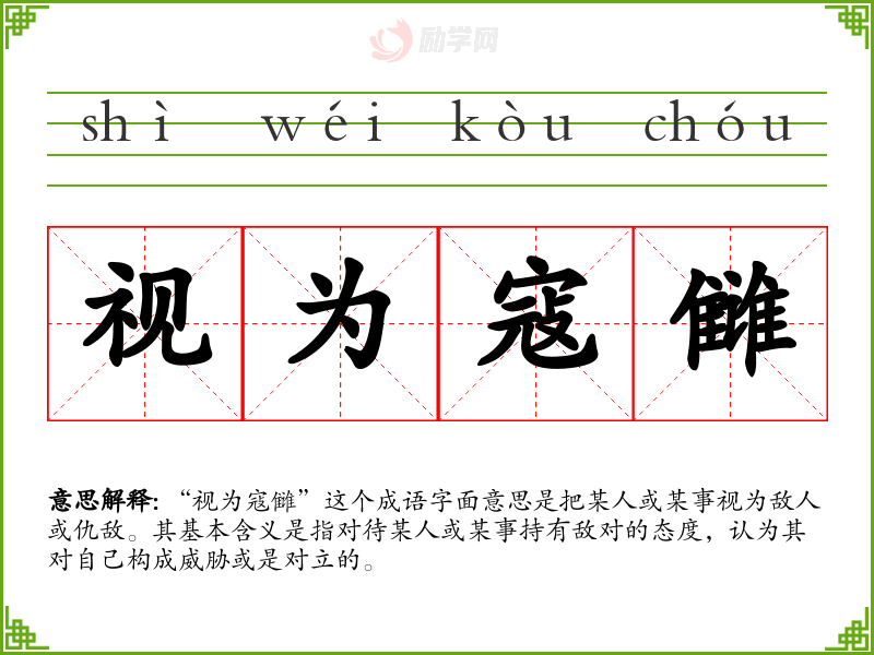 “视为寇雠”这个成语字面意思是把某人或某事视为敌人或仇敌。其基本含义是指对待某人或某事持有敌对的态度,认为其对自己构成威胁或是对立的。
