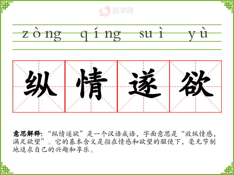 “纵情遂欲”是一个汉语成语,字面意思是“放纵情感,满足欲望”。它的基本含义是指在情感和欲望的驱使下,毫无节制地追求自己的兴趣和享乐。