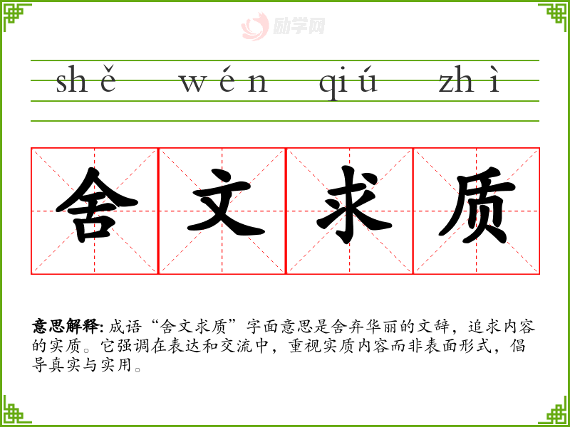 成语“舍文求质”字面意思是舍弃华丽的文辞,追求内容的实质。它强调在表达和交流中,重视实质内容而非表面形式,倡导真实与实用。