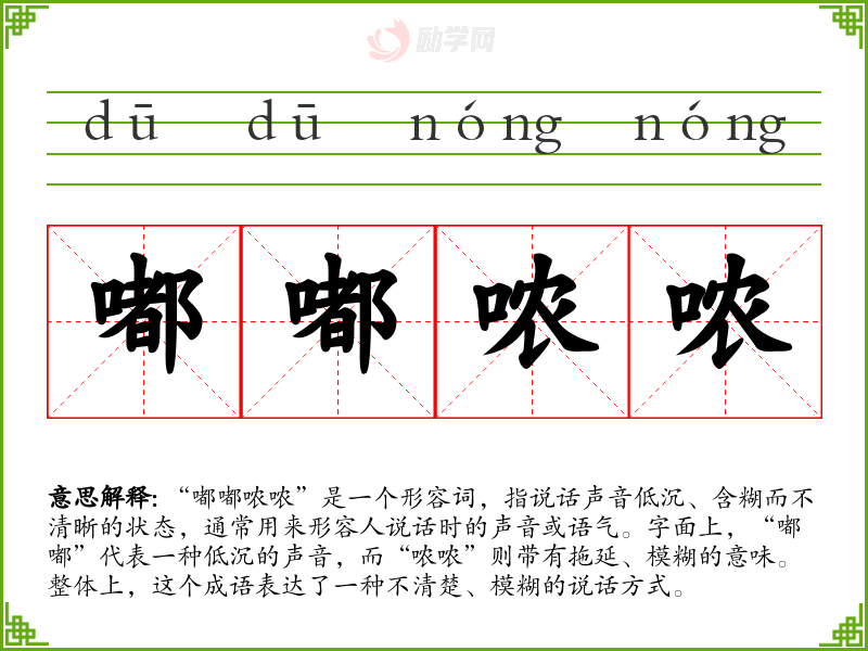 “嘟嘟哝哝”是一个形容词,指说话声音低沉、含糊而不清晰的状态,通常用来形容人说话时的声音或语气。字面上,“嘟嘟”代表一种低沉的声音,而“哝哝”则带有拖延、模糊的意味。整体上,这个成语表达了一种不清楚、模糊的说话方式。