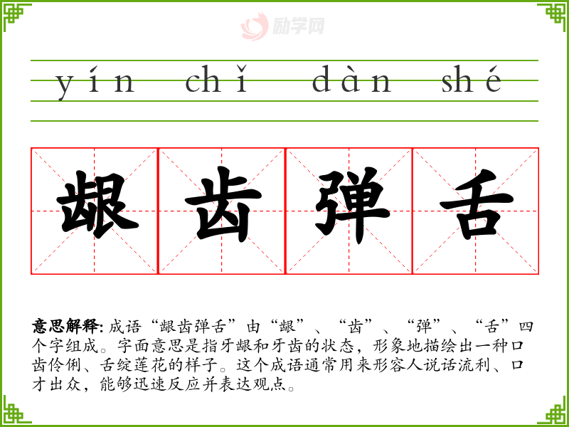 成语“龈齿弹舌”由“龈”、“齿”、“弹”、“舌”四个字组成。字面意思是指牙龈和牙齿的状态,形象地描绘出一种口齿伶俐、舌绽莲花的样子。这个成语通常用来形容人说话流利、口才出众,能够迅速反应并表达观点。