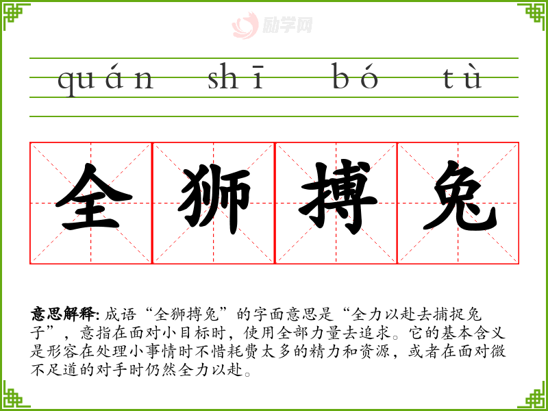 在现代社会中,尤其是在工作和生活压力越来越大的背景下,许多人往往会在一些小事情上过度投入,反映出社会对效率和成果的追求。使用“全狮搏兔”可以提醒人们要理性对待目标,避免在小事上浪费精力。