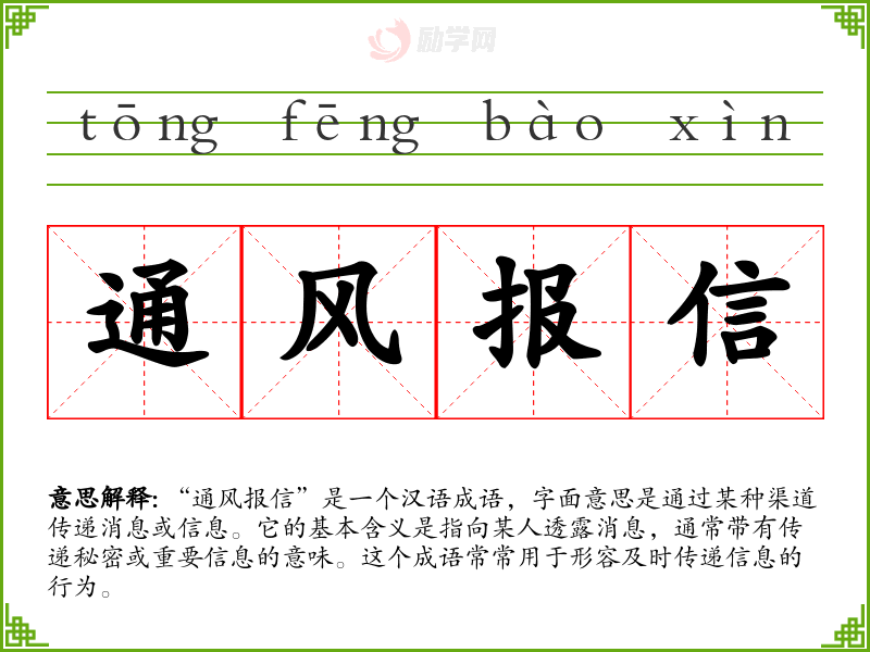 通过对“通风报信”的学习,我更加理解了信息传递在沟通中的重要性。这个成语在现代社会依然适用,提醒我们在沟通时要灵活运用语言,确保信息的准确传递。同时,它也让我意识到在学习和表达中,成语的使用能够增强语言的表现力和感染力。