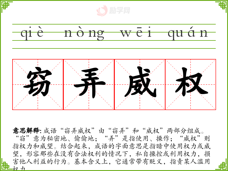 “窃弄威权”在**历史上有着深刻的文化背景,尤其是在封建社会,权力的集中与滥用是常见现象。现代社会中,该成语仍然适用,尤其在对官员、企业领导等权力人物的监督和批评中,反映了人们对权力的警惕和对正义的渴求。