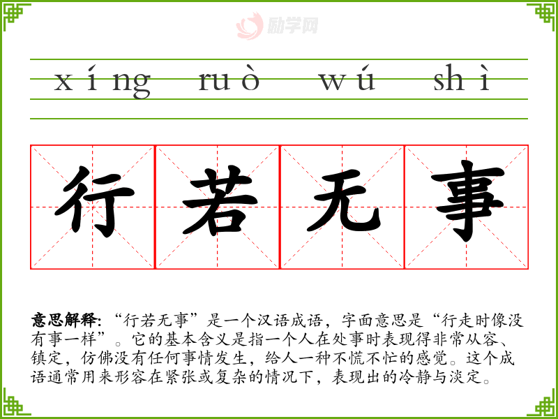 - 演讲:在演讲中可以用来强调冷静应对挑战的重要性,例如:“在危机时刻,行若无事是我们成功的关键。”