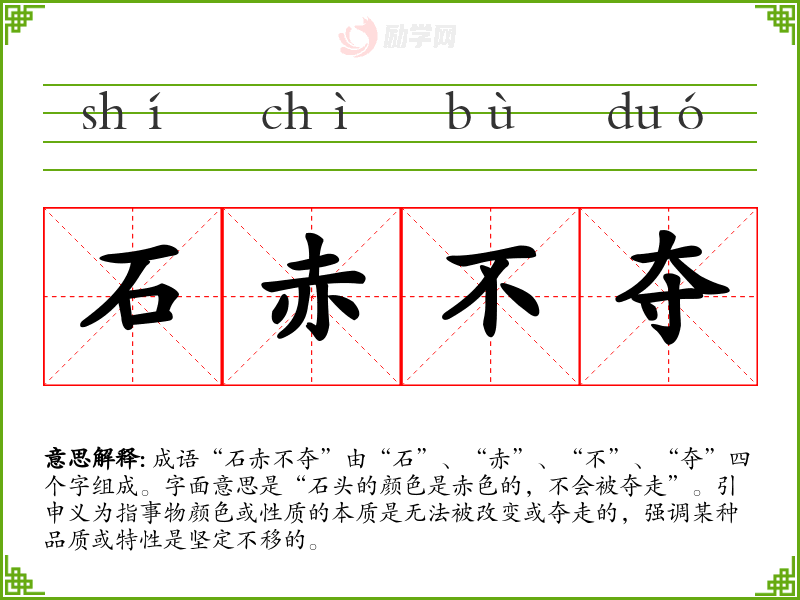 成语“石赤不夺”由“石”、“赤”、“不”、“夺”四个字组成。字面意思是“石头的颜色是赤色的,不会被夺走”。引申义为指事物颜色或性质的本质是无法被改变或夺走的,强调某种品质或特性是坚定不移的。
