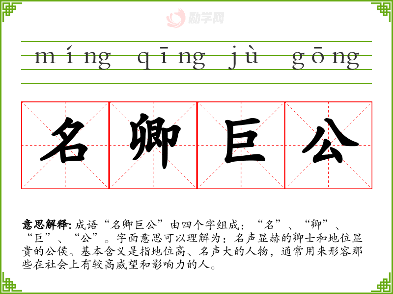 成语“名卿巨公”由四个字组成:“名”、“卿”、“巨”、“公”。字面意思可以理解为:名声显赫的卿士和地位显贵的公侯。基本含义是指地位高、名声大的人物,通常用来形容那些在社会上有较高威望和影响力的人。