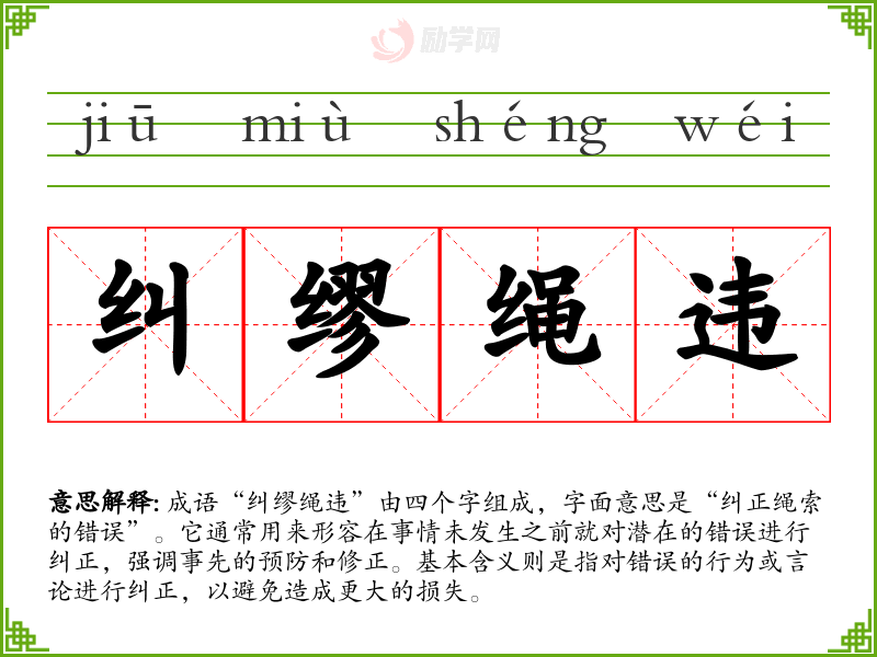 成语“纠缪绳违”由四个字组成,字面意思是“纠正绳索的错误”。它通常用来形容在事情未发生之前就对潜在的错误进行纠正,强调事先的预防和修正。基本含义则是指对错误的行为或言论进行纠正,以避免造成更大的损失。