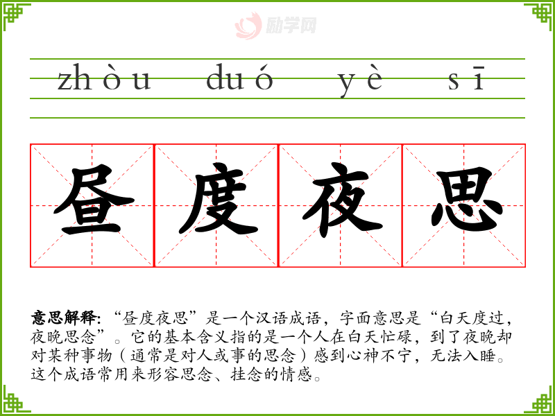通过对“昼度夜思”的学习,我意识到思念是一种普遍的情感,跨越了时间和文化的界限。这个成语在语言学习和表达中具有重要意义,它不仅能丰富我们的词汇,更能帮助我们准确表达复杂的情感。在未来的交流中,我会更加灵活地运用这一成语,传达我内心的真实感受。