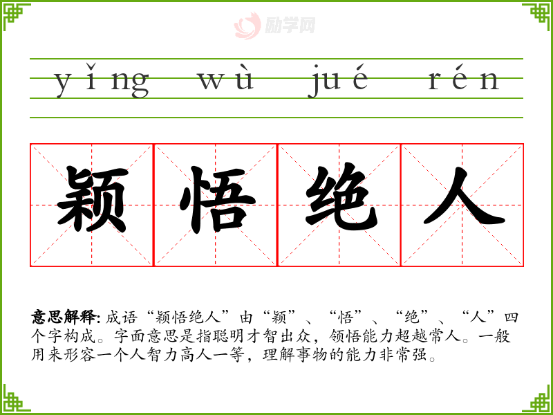 成语“颖悟绝人”由“颖”、“悟”、“绝”、“人”四个字构成。字面意思是指聪明才智出众,领悟能力超越常人。一般用来形容一个人智力高人一等,理解事物的能力非常强。