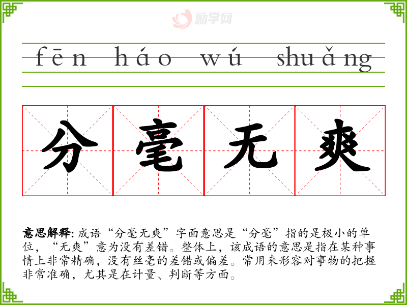 通过对“分毫无爽”的学,我更深入地理解了在表达准确性和严谨性时的重要性。这不仅对我的语言学有帮助,也让我在日常生活中更加注重细节,追求高标准的工作与生活。这个成语提醒我,成功往往源于对细节的关注。