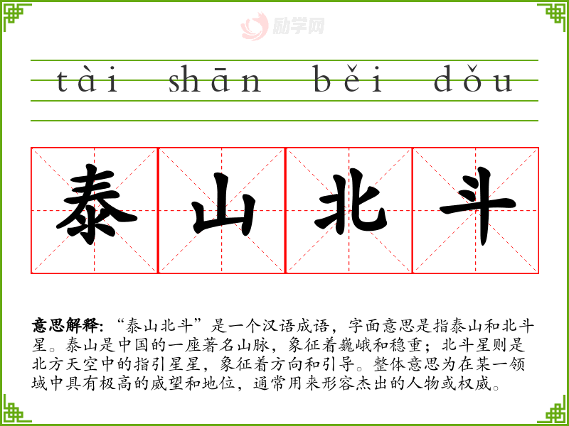 通过对“泰山北斗”的学,我认识到这个成语不仅仅是对个人成就的赞美,也是一种对追求卓越的鼓励。在我的语言学和表达中,使用这样具有深厚文化背景的成语,可以提升表达的层次感和深度,帮助我更好地传达对人和事的尊重与敬仰。