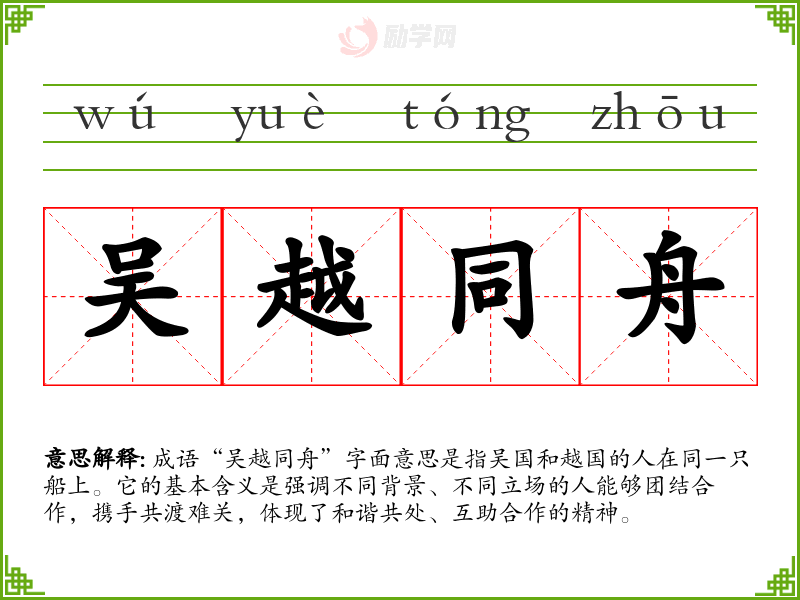 成语“吴越同舟”字面意思是指吴国和越国的人在同一只船上。它的基本含义是强调不同背景、不同立场的人能够团结合作,携手共渡难关,体现了和谐共处、互助合作的精神。
