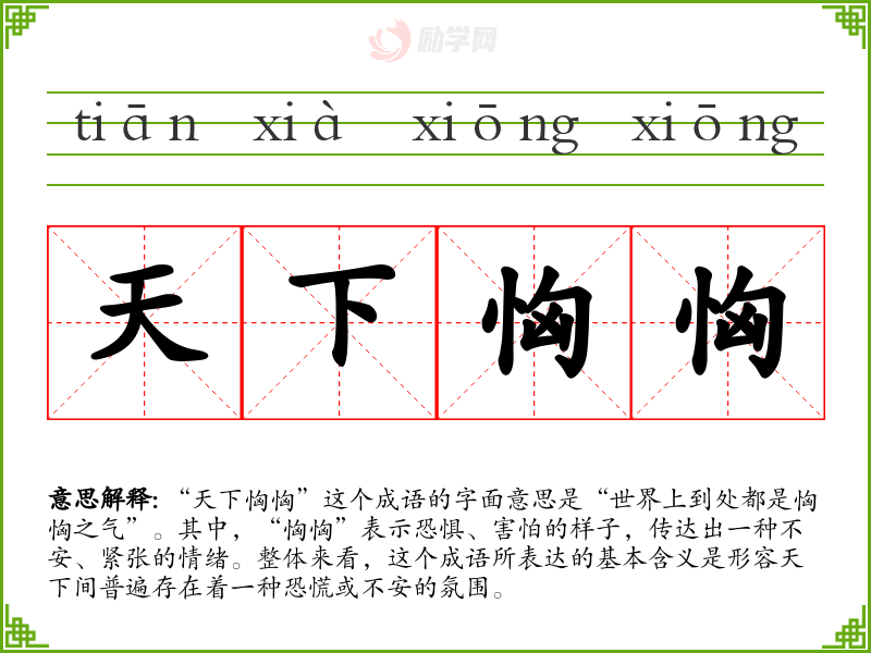 - 演讲:在讨论社会问题或政治动荡时,演讲者可以用“天下恟恟”来强调人们的不安和对未来的担忧。