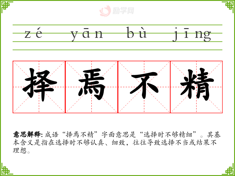 成语“择焉不精”字面意思是“选择时不够精细”。其基本含义是指在选择时不够认真、细致,往往导致选择不当或结果不理想。
