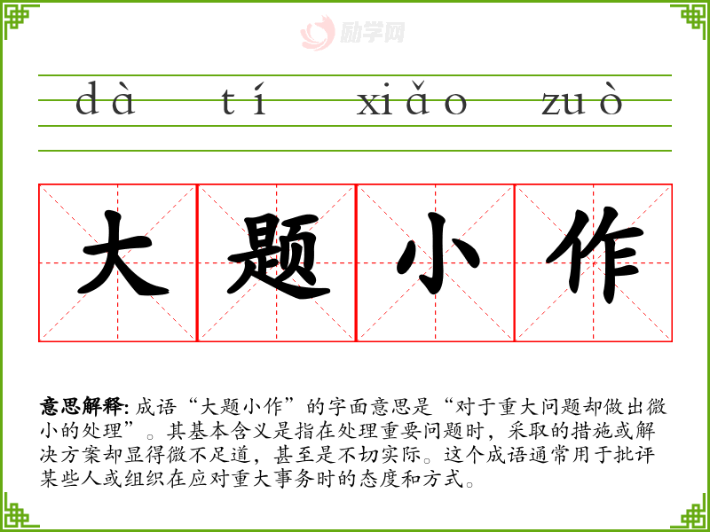 成语“大题小作”的字面意思是“对于重大问题却做出微小的处理”。其基本含义是指在处理重要问题时,采取的措施或解决方案却显得微不足道,甚至是不切实际。这个成语通常用于批评某些人或组织在应对重大事务时的态度和方式。