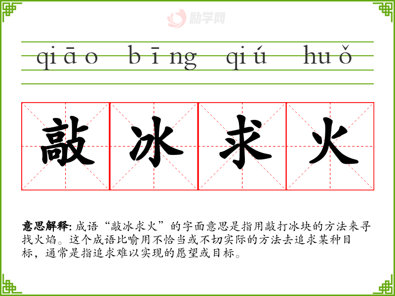 成语“敲冰求火”的字面意思是指用敲打冰块的方法来寻找火焰。这个成语比喻用不恰当或不切实际的方法去追求某种目标,通常是指追求难以实现的愿望或目标。