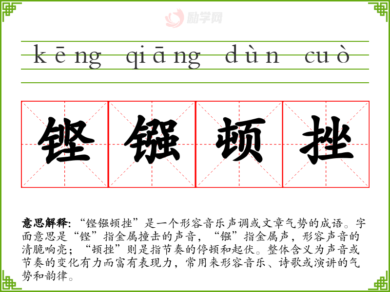 通过对“铿镪顿挫”的分析,我更加理解了语言的韵律与情感表达之间的关系。这个成语不仅丰富了我的词汇量,也让我在写作和表达中更加注重声音的变化和节奏的把握。它在我语言学*和表达中具有重要的指导意义。