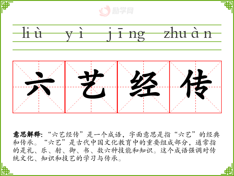“六艺经传”是一个成语,字面意思是指“六艺”的经典和传承。“六艺”是古代*文化教育中的重要组成部分,通常指的是礼、乐、射、御、书、数六种技能和知识。这个成语强调对传统文化、知识和技艺的学与传承。
