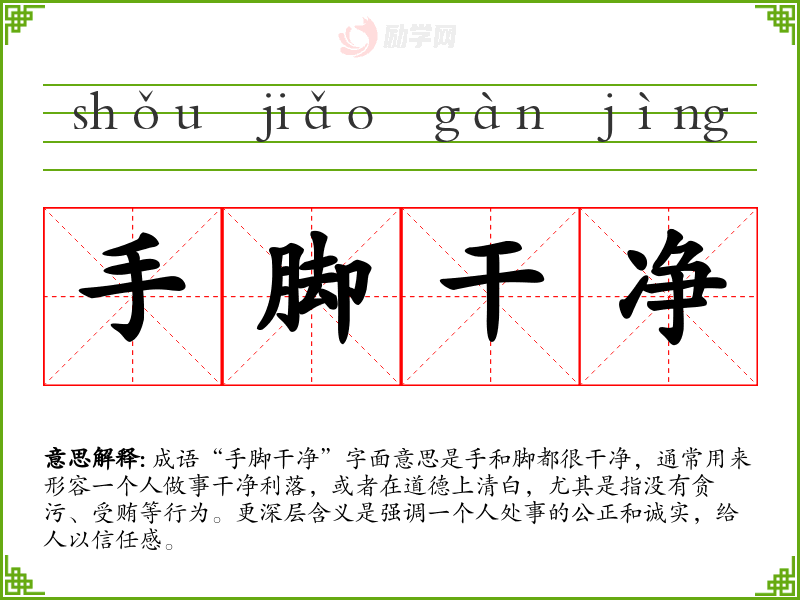 成语“手脚干净”字面意思是手和脚都很干净,通常用来形容一个人做事干净利落,或者在道德上清白,尤其是指没有贪污、受贿等行为。更深层含义是强调一个人处事的公正和诚实,给人以信任感。