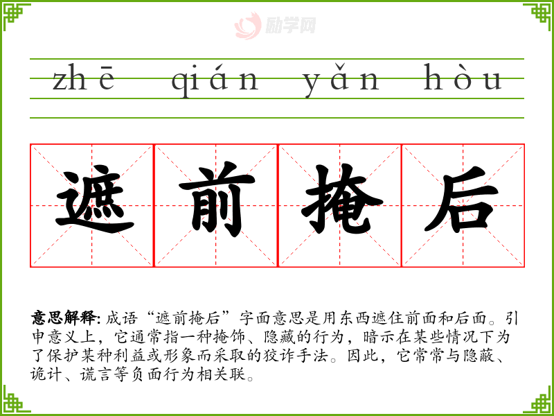 “遮前掩后”没有明确的历史典故,但其构造可以追溯到古代文学中常见的“遮”、“掩”这类词汇。成语中的“遮”和“掩”都含有隐藏、遮挡之意,反映了古代人们对隐蔽、伪装行为的警惕与批判。