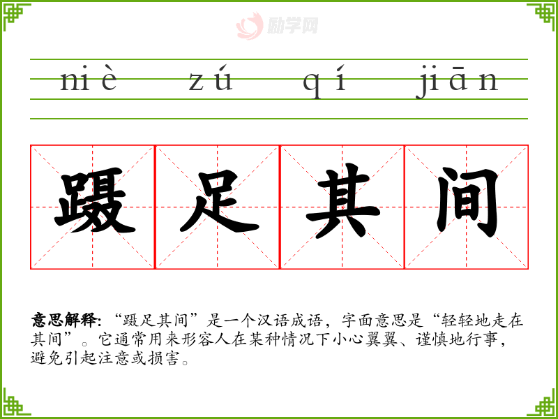“蹑足其间”是一个汉语成语,字面意思是“轻轻地走在其间”。它通常用来形容人在某种情况下小心翼翼、谨慎地行事,避免引起注意或损害。