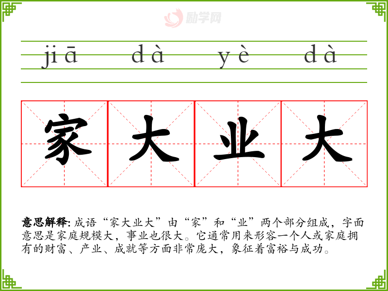 成语“家大业大”由“家”和“业”两个部分组成,字面意思是家庭规模大,事业也很大。它通常用来形容一个人或家庭拥有的财富、产业、成就等方面非常庞大,象征着富裕与成功。