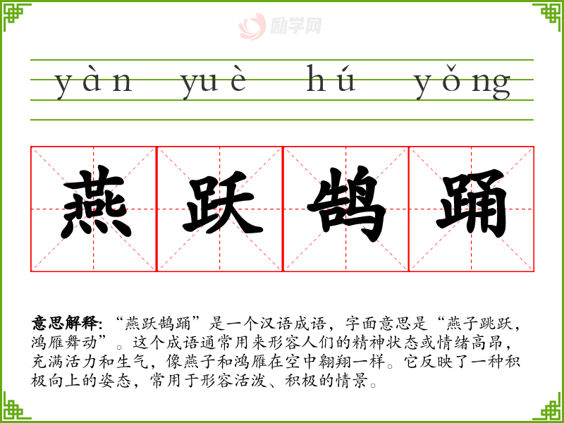 “燕跃鹄踊”是一个汉语成语,字面意思是“燕子跳跃,鸿雁舞动”。这个成语通常用来形容人们的精神状态或情绪高昂,充满活力和生气,像燕子和鸿雁在空中翱翔一样。它反映了一种积极向上的姿态,常用于形容活泼、积极的情景。
