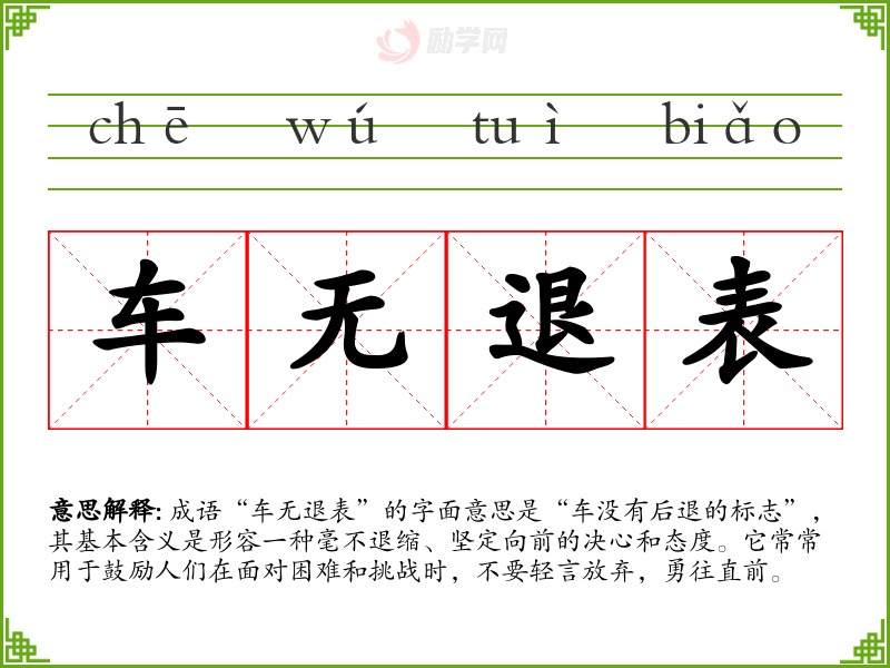 通过对“车无退表”的学,我更加理解了坚持和勇气的重要性。在我的语言学和表达中,这个成语不仅丰富了我的词汇量,也为我提供了表达态度和情感的有力工具。它提醒我们,在生活的每一个阶段,都要以坚定的信念去面对挑战。
