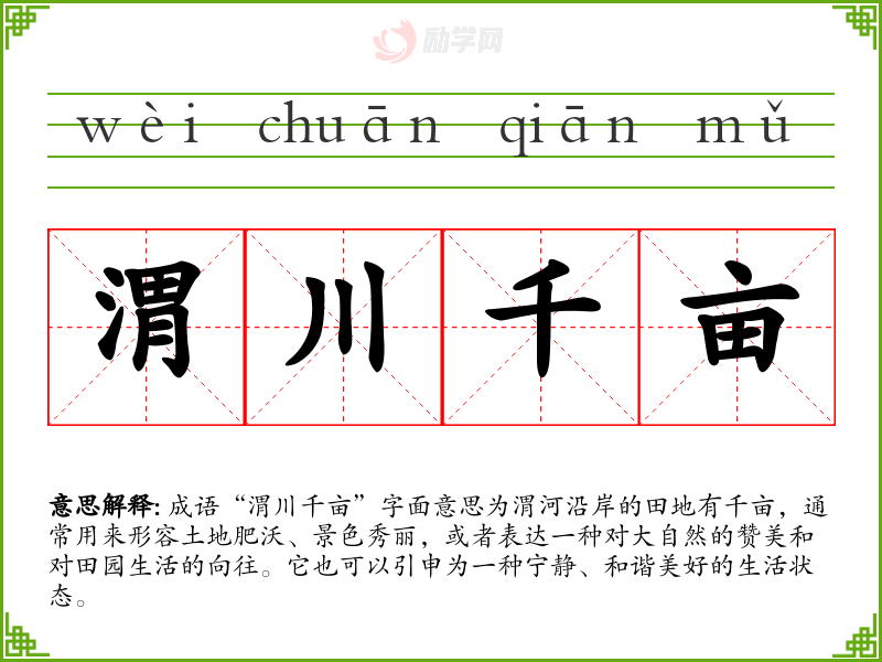 成语“渭川千亩”字面意思为渭河沿岸的田地有千亩,通常用来形容土地肥沃、景色秀丽,或者表达一种对大自然的赞美和对田园生活的向往。它也可以引申为一种宁静、和谐美好的生活状态。
